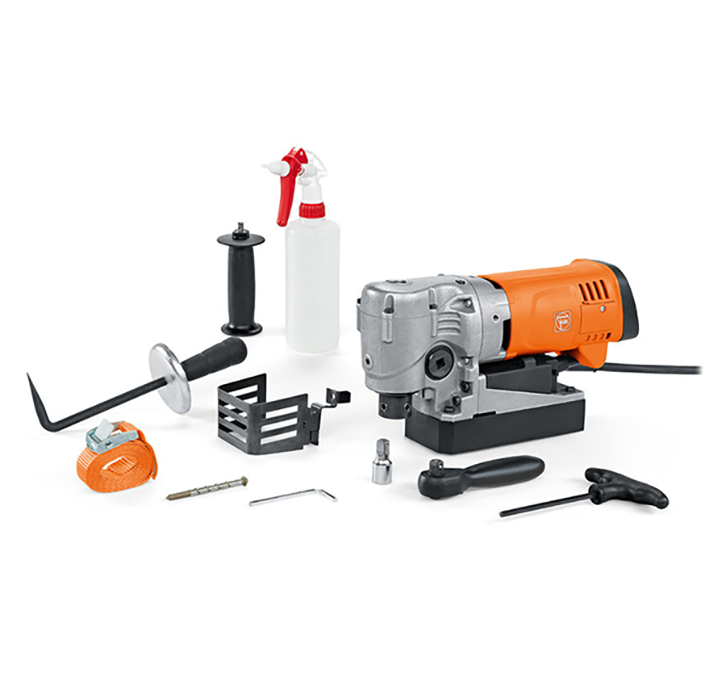 转速稳定的 FEIN 1.100-W 高功率电机带有自动调速装置和正转/反转开关,可应用于空心钻孔、麻花钻孔、攻丝和扩孔等全部应用,作业进度与切割速度都极为出色。